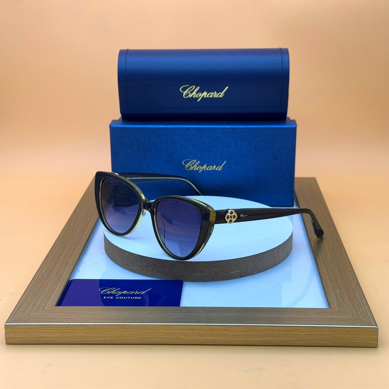 نشانِ اصالت شوپارد: لوگوی ظریف و پرافتخار عینک Chopard بر روی دستهها، امضای تضمینشدهای از کیفیت، اصالت و prestige (اعتبار) بالا است.